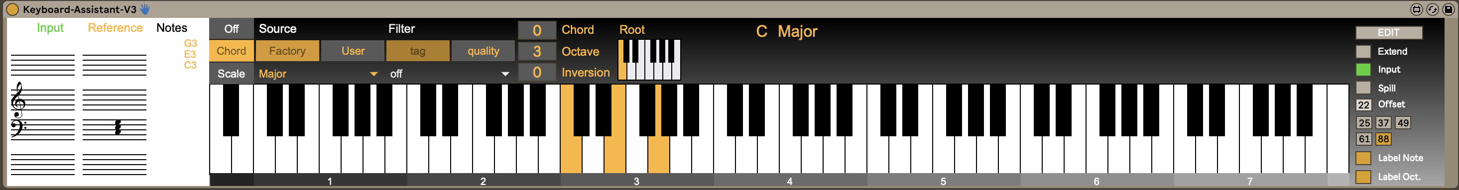 Description: Reference a virtual keyboard that includes chord and scale modes with editable user collections. Quickly see side by side notation view.