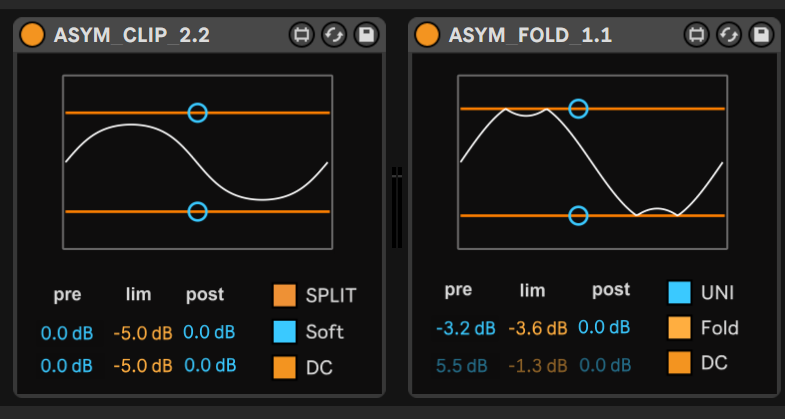 | Description: | Asymmetric clip effect Different clipping can be done on the top and bottom of the waveform. pre: pre gain lim: clip limitter post: post gain SPLIT UNI: mode Soft Hard : hard clip or soft clip mode |