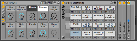 | Description: | ElectroLite FREE side chaining template The ElectroLite drum rack contains percussive sounds that were sampled from Ableton Live 11 Suite’s collection of synthesizers. Using sampler and simpler inside the drum rack instead of the original synthesizers greatly cuts down on CPU usage. So using this template will give you the electro drum sounds from Ableton’s various synths while being ‘Lite’ on your CPU. Side Chaining Each drum pad that is listed as ‘Multi’ is a drum that is side chained against the rest of the drums in the rack: -> C1 - Kick [12 different selectable kicks] -> D#1 - Clap -> E1 - Snare [choice of long or short] Any instruments or samples that are placed inside the white track group called ‘Duck SC’ will also be made quieter [or ducked] whenever the drums listed above are played. Macro Knobs The macro knobs on the ElectroLite Drum Rack control everything important. Here’s a list of each one of them and a description of what they do: Kick Selector Rotate to switch between 12 different kick choices Snare Lng/Shrt Choose between a long or short snare sound Thresh Threshold - This knob controls how much the volume is dropped [or ducked] when each side chained drum is played. -Inf db is the maximum amount and is the setting to use if you want to hear that specific pumping ‘side chained effect.’ This one knob controls the threshold for both the side chain compressor inside the drum rack as well as the one on the Duck SC track group. Release This knob controls the length of time that signal is ducked every time a side chained drum is triggered. Choose a range between 20 and 250ms. Like the previous knob, ‘release’ controls the settings for the side chain compressor inside the drum rack as well as the one on the Duck SC track group. Kick Length Use this knob to control the length of the kick sample [100 - 800ms]. This length applies to any and all of the kick choices available. Kick Pitch Rotate this knob to raise or lower the pitch of the kick drum [-12st thru +12st] Noiz Pitch Changes the pitch of the ‘Noiz Tube’ drum that sits on key C2. Adjust to keep this drum in tune with the rest of your mix. Punch This knob is connected to the 'Transients' knob on the drum bus effect. Positive values make all drums louder and punchier while negative values do the opposite. Filter Cutoff This knob is connected to a low pass filter that applies to the entire drum rack. Rotating to the left cuts the high frequencies while rotating to the right brings them back. Mix Optimizing / Mastering Chain The master track has a mastering effects chain included that is made up of stock Ableton effects. For best results, the master channel should be fed with a level of -6 db. |
