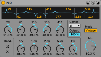 | Description: | rEQ is a 10 band resonant equaliser, based on / inspired by the classic Serge Resonant EQ. The device has a display for every band, a random/reset knob-pair and a vintage mode, with IR based colouring. (The IR was captured from a real ResEQ.) The output could be controlled, in case of "rumbling" bottom ends and the Mix knob blends between the dry and wet signal. https://youtu.be/N5utwGOs2O4 Version History : 1.oo - release 1.o1 - Live session save and load bug fixed, now it'll remember the EQ states correctly 1.o2 - Live 12 compatibility check |