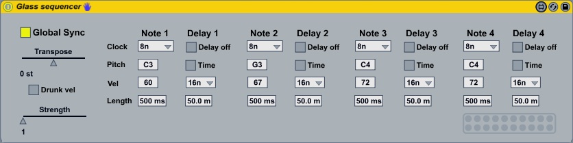 My first post to this wonderful devices collection. A four note tempo driven sequencer reminiscent (to me) of Philip Glass (so... that's why !) or Michael Nyman works. You can choose the notes pitch with the mouse or your midi kbd. Interesting time shifting possibilities with the delay options. For now, you have to change the 'drunk strength' setting to get it to work. Don't know why because there's an argument for the drunk step size... Everything is midi mapable because I like to keep control before trying the random stuff (even if I always end up clicking on it). Thanks to Broc and Chapelier Fou for helping me in splitting the chord from the kbd (damn unpack object...). |