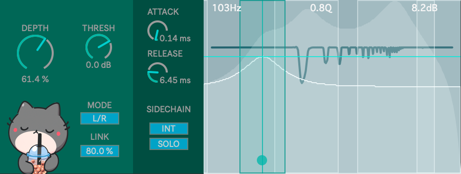 | Description: | I won't beat around the bush. This is my take on Soothe2. Boba applies an FFT of an internal/external side-chain input to determine which frequency bin is above the threshold. The threshold itself is roughly weighted to pink noise, and can be shifted up or down using the "Thresh" dial. The difference between the actual level and threshold level is evaluated for a given frequency, then up to that amount of gain reduction can be applied to the carrier (main) signal when "Depth" is at 100%. The reduction is actually done with envelope followers on each frequency band, so the timing can be adjusted with the "Attack" and "Release" controls. There is also a 5-band EQ on the side-chain signal before the FFT so that you can emphasis the frequency you want to focus your reduction on by boosting, or conversely, deemphasis what you the frequencies you don't want to analyze but applying an EQ cut. This can be somewhat counterintuitive at first, but proves to be an effective control mechanism, as a boosted frequency is more likely to pass the threshold levels in that frequency region. Additionally, there you can switch between stereo mode (left/right) and mid-side mode, as well as tune the amount of stereo linking. |