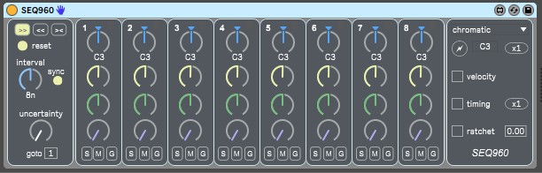 | Description: | SEQ960 is my tribute to a well known sequencer that powered many electronic bands in the 1970's. It features 4 programmable rows. Row1 controls pitch and can be constrained to a chosen scale, octave range and root note as well as randomised. Row2 controls note velocity which can be used by many plugin synths to control filter cut-off etc. Row3 controls note timing so complex rhythmic patterns can be easily generated. Row4 controls the classic ratchet effect associated with this type of sequencer. There is a control to vary the damping of the repeats to reduce the 'machine gun' effect. Each note column has Skip, Mute and Go-to buttons for further control of the sequencer pattern. The go-to stage can be set to any of the 8 stages and a level of uncertainty can be applied to the go-to decision. Have fun! |