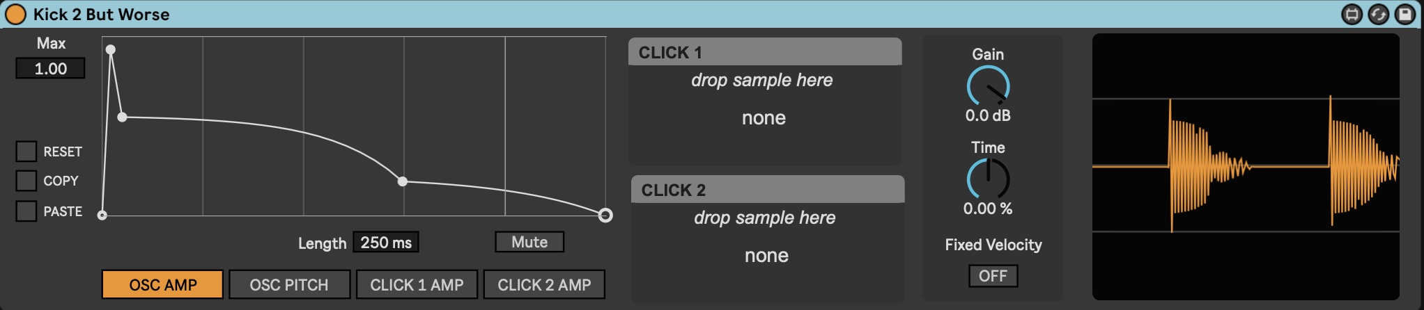 | Description: | Kick drum instrument with: - amplitude and pitch envelopes of a sine wave - amplitude envelopes of two click layers (with sample drop for each) - micro timing delays for the clicks - global time adjustment - fixed velocity on/off - envelope copy/pasting - oscilloscope Enter info view and hover over an envelope to see editing controls. |