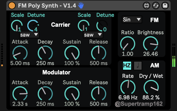 | Description: | PolyFM is a synthesizer instrument designed for Ableton Live, offering polyphonic FM synthesis with AM capabilities with standard selectable waveforms. This Synth allows you to create rich and complex sounds by modulating multiple oscillators. Each oscillator is now able to be individually detuned. If you like my work and wish to collaborate or contact me, the best place to do so is through my instagram @supertramp162. https://linktr.ee/supertramp162 |