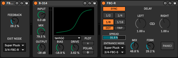 | Description: | FBC let's you add your own effects into the delay line so that you can build any delay you like. There is a send node and a receive node (entrance/exit node) with the effects chain sandwiched in-between them. To use, drop FBC-S in the device rack first and FBC-R second. Insert any audio effects you like in between them. On each of the node devices, you must send configure the audio routing to point at the other device in the pair. Then you can safely turn off the "Panic!" button that mutes the outputs. |