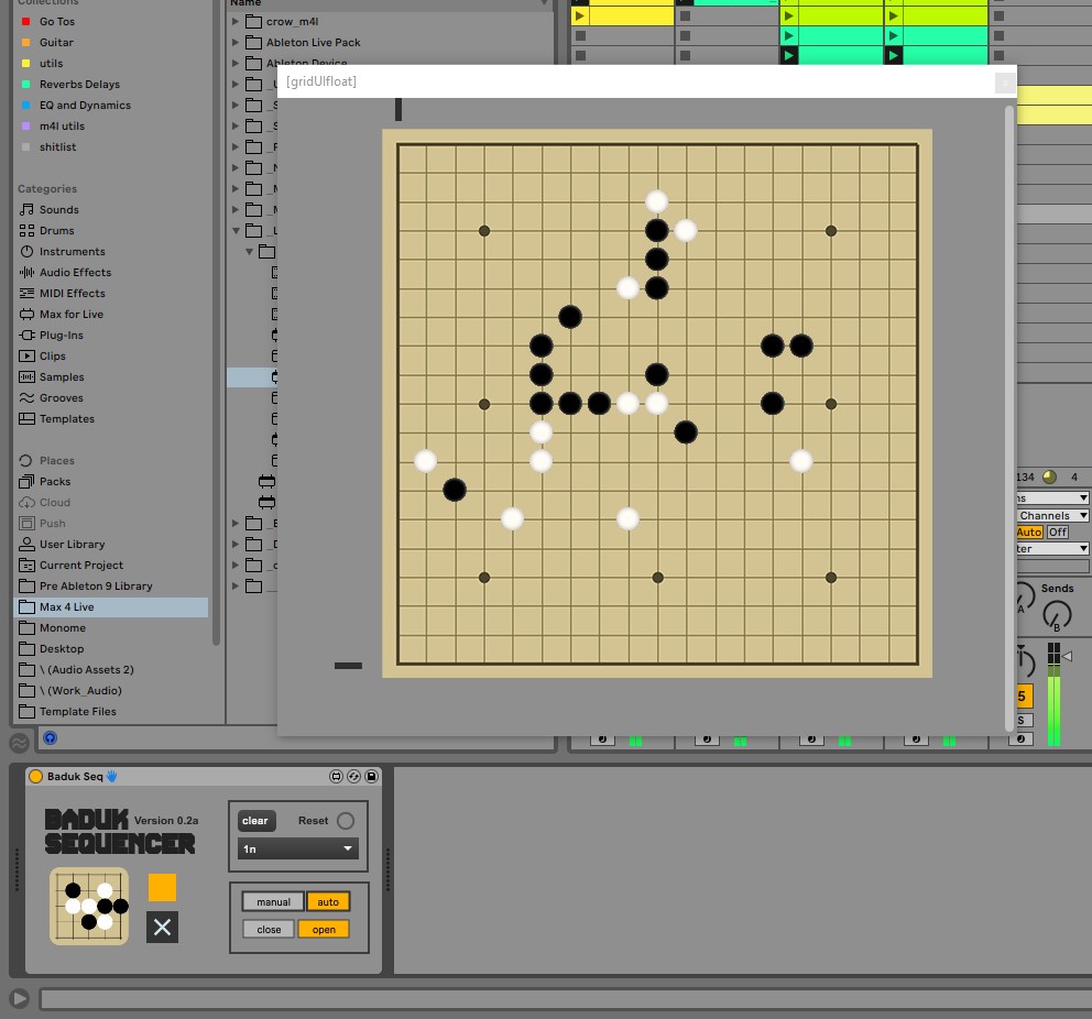 | Description: | Fully playable game of Baduk in M4L. A note will trigger when a piece is placed. Use the receiver pieces to trigger a pulse on an empty midi channel. I use this to trigger random notes, move sequencers forward, or to trigger clips in LIVE. I'd love to see what is possible in someone else's hands. Notes: Baduk Seq doesnt like starting when Live's clock starts. 1-start clock 2-select timing division 3-Hit the toggle to start the sequencer |