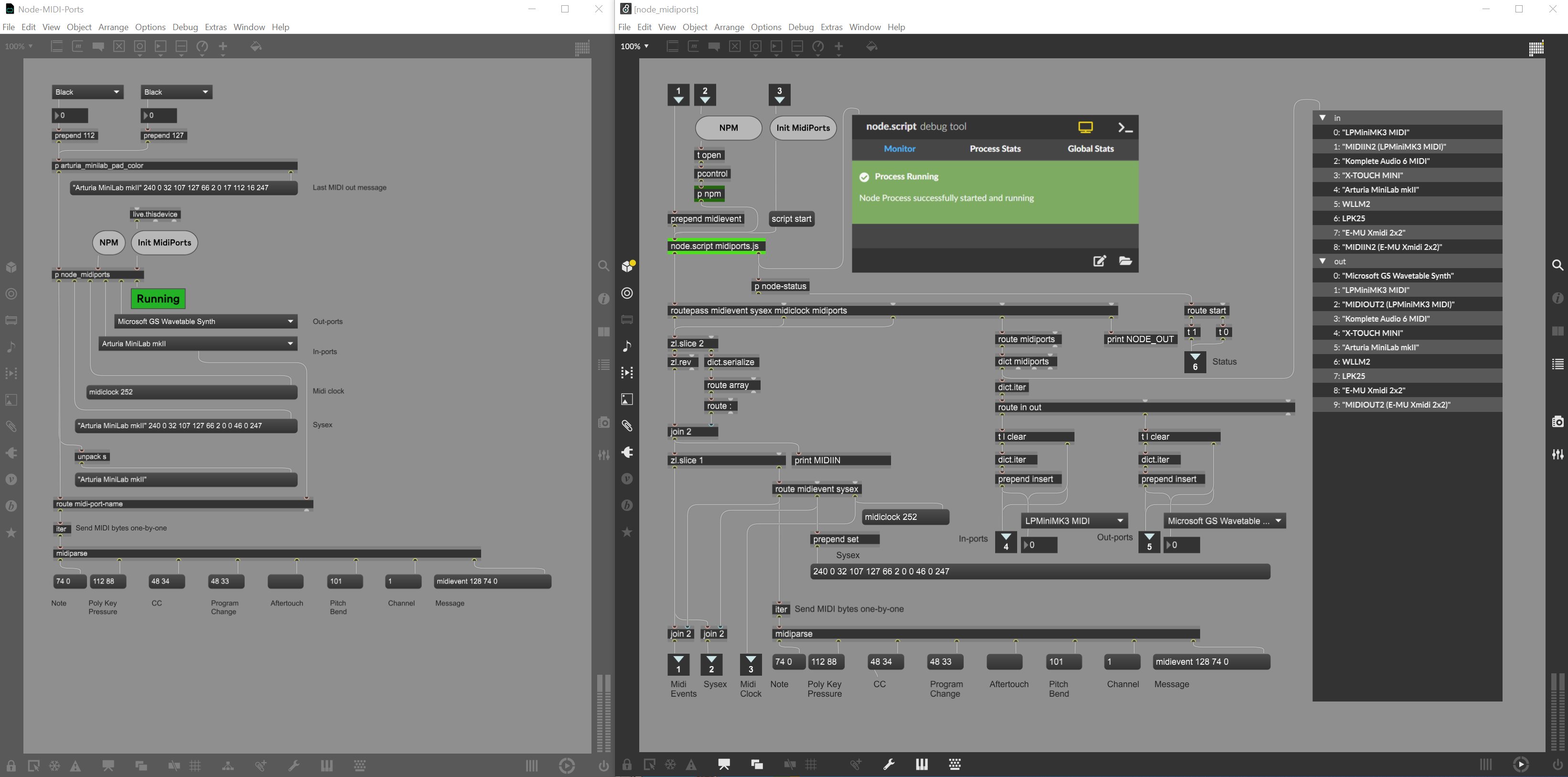 | Description: | Node MIDI Ports As we all know, Ableton has its own ideas of handling MIDI signals. As a result we don’t get all messages and we only get one channel at a time. We can only get one MIDI controller for each track. We have no access to the MIDI system of Max itself. For my current project a need full access to several MIDI controllers, together with a Stream-Deck device they form a meta controller. I use this utility to capture all MIDI controllers that I need. I hereby share it with you. It is a wrapper for the NPM library Midi for Node.JS. At the center of the device is a NodeForMax object with a script that acts as a wrapper for the NPM Midi library. The rest of the code is a demo to get you going. Its not a standalone thing, it is always a part of the project that uses it. The central part is the node_midiports patcher. It spits out the short midievents, sysex messages and clock signals of MIDI devices. The last 2 outlets can be connected to umenus that will be filled with the MIDI in and out devices. Only MIDI devices that are disabled in both Ableton Live and MaxForLive will become active. For MIDI out the node_midiports patcher will accept a seuqnece of MIDI bytes preceded by the axact name of the MIDI device. Before the first use you have to click the NPM button which will popup a window with three commands to install NPM and the Midi library. Whenever needed you click the ‘Init MidiPorts’ button. I believe studying the patcher will show how it can be used in detail. |