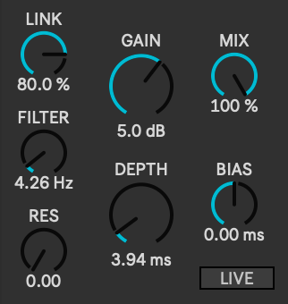 | Description: | I was requested to make a M4L distortion, and the timing worked out well for me. This was a quick and fun effect to spin up (1h) yay! :) Phase Distortion is similar to a vibrato/chorus effect, except that rather than modulating the delay line with a traditional LFO, a copy of the input signal is fed forward through a lowpass filter to become the control signal. This is a bit of a niche effect, but should work well in some contexts! I referenced the Logic Pro and Kilohearts effects while choosing what features to include in my version. Some things to note: 1) A lower cutoff on the LPF will result in a smoother and less sporadic and glitchy delay modulation. The opposite is also true. 2) The modulation is bipolar so the Depth parameter will modulate +/- that delay amount in milliseconds. The Bias is a static number added to / subtracted from this, so the wet delay time = Depth + Bias 3) Because the modulation is bipolar, the delay would need to be biased so as to not exceed the bounds of the delay line buffer (100ms). This is especially important if the modulation was to push the delay line to a negative number... which is impossible because the delay can only access past and present values, it cannot see into the future! The delay line is clipped at 0ms and 100ms, and for the maximum symmetrical modulation depth, we would need a real bias of 50ms and a Depth 50ms. 4) This are not as they seem. The delay line always self-biases to the value of the Depth parameter. This means that if you turn the Depth up to 20ms (and the Bias parameter is set to 0ms), the delay line will self bias so that you have +/- 20ms of modulation centred about 20ms. This gives a 0ms to 40ms modulation range. 5) The Bias parameter is in addition to this self-biasing behaviour, so it can actually be used to push the the delay into clipping (at its 0ms or 100ms end points). 6) When Live mode is OFF, two things happen: a) A static delay is applied to the DRY signal path with the length of the Depth + Bias parameters. This phase sync's the dry and wet signal, aside from the ongoing modulation (basically so they are both biased to the same delay). b) The M4L devices reports this latency of the dry signal delay length (Depth + Bias parameters). Ableton should latency compensate this device relative to other tracks, but this mode is not recommended for real time performance, nor is it ideal for modulating/automating the Depth and Bias parameters. 7) When Live mode is ON, the dry signal is NOT delayed, and the device reports 0ms of latency (following the dry signal's delay). 8) The Gain parameter controls a drive into a tanh() block (soft clipping / saturation) on the sidechain / modulation signal. This follows the LPF and both compresses the modulation signal as well as clamping it to be within the -1 to 1 range. 9) The Mix control can (will) phase. If you don't like this, you may want to leave it at 100%. You should be able to "mix" using the Bias control as well, by deliberately introducing asymmetric (clipped) delays at the top or bottom end of the delay time range. Use this in conjunction with the Depth control to find something that sounds good to you. This effect is intended to mangle, and is full of happy accidents. If you are after subtlety, you will have a to work a little harder! |