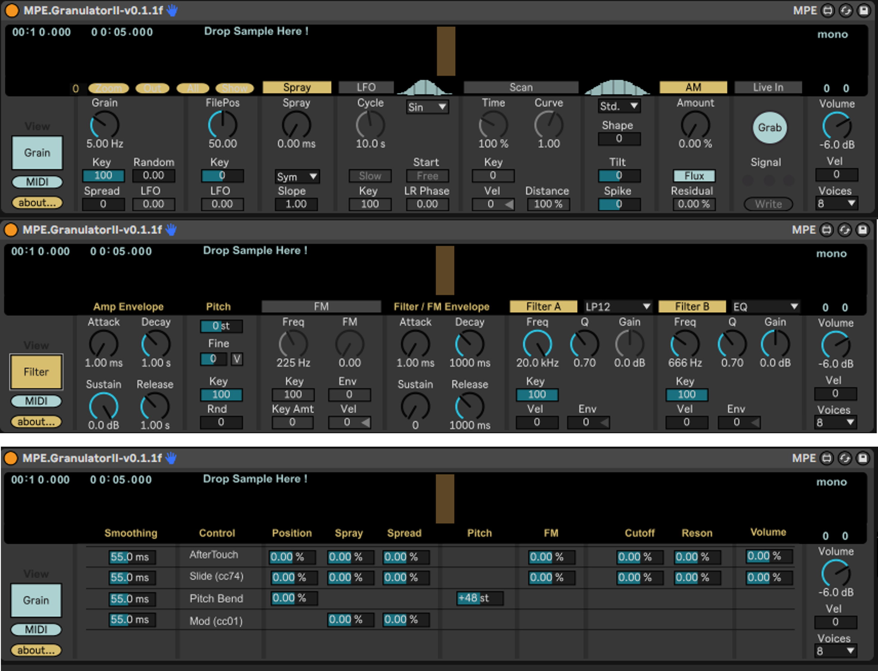 | Description: | MPE addition to Granulator II by Robert Henke Excited for Granulator III and MPE, but already working a lot with Granulator II? If you have projects that are already mapped to Granulator II, this device keeps all the same UI items except for the sustain pedal. You will notice the hold button is missing. It adds MPE control on a new tab. The live.banks mapping is the same for the first two pages, with three more pages for MPE configuration on Push. I put MPE at the front of the file name, as it only takes me 5 characters to get this device to come up in a short list. If i type in Granu... i get a lot of other stuff... maybe other granular nerds can relate? inside the instrument you can find any modified code and subpatchers hightlighted in red. |