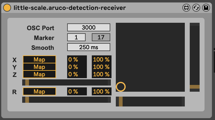 Receive data from ArUco markers via OSC and map X, Y, Z and rotation of a marker to Ableton Live parameters. Use in conjunction with the Python script found here: https://github.com/little-scale/ArUco2osc/ |