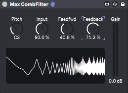 | Description: | A simple M4L Comb Filter that includes basic feedback and feedforward controls. The frequency knob is tuned to note values for better tonal control. Additionally the shape of the Comb Filter is displayed in real time for a more visual feedback. I couldn't really find anything like it anywhere so I threw it together myself, hope you enjoy it as well! The Device is a modification of the Max Comb Filter from the Max for Live Building Tools Pack by Cycling '74. |