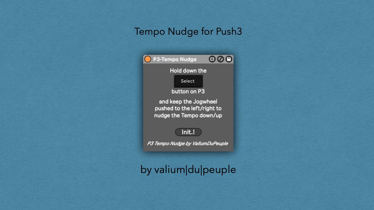 | Description: | Need Live's Tempo Nudge control from Push3 and/or inside Push3 Standalone? Here you go with this free M4L device This device works with Push3 Standalone and Controller. Place the device anywhere in your set (I recommend the Master track, or any Utilities track you might have). Hold down the Select button, and push the Jogwheel to: - the right to nudge the tempo up - the left to nudge the tempo down If you release the Select button before releasing the Jogwheel, the nudge will be "locked". You can take advantage of this (and just hold Select and push the Jogwheel again to unlock it), but if you want to avoid it just make sure that the last action is always the release of the Select button, so the order for e.g tempo up would be: 1- Hold down the Select button 2- push the Jogwheel to the right 3- when you want to stop nudging, release the Jogwheel 4- release the Select button There's a "Init." button, use it in case the device stops working correctly. Due to a P3/M4L bug, you need to use the current Live 11 and Push 3 beta minimum (L11.3.20bx), and/or the current Live 12 beta. |