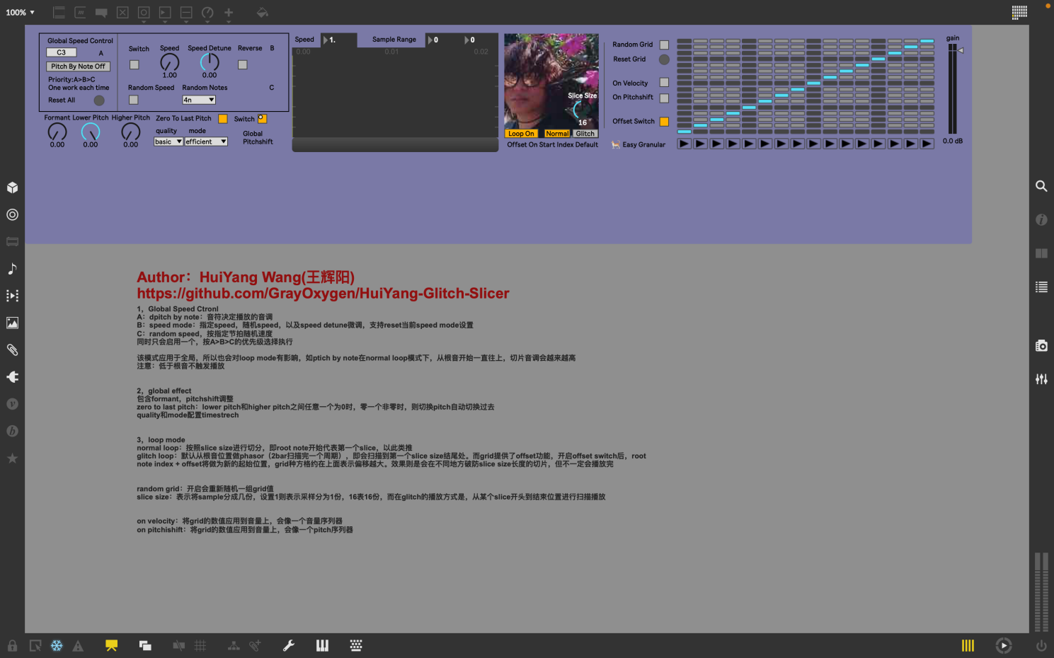 | Description: | Author:Hui Yang Wang(王辉阳) This plugin is my first max 4 live plugin, which is a simple slicer that allows the addition of glitch and granular effect, featuring three major modules: Global Speed Control 1. Pitch by Note Mode: Pitch is determined by the note's high or low, affecting the pitch of the slice. 2. Manual Speed Control: Allows for manual speed adjustments, including reverse playback. 3. Random Speed on Specified Beats: Speed can be randomized at specific beats. Global Pitch Control 1. Formant Sound Control: Adjusts the sound's formant. 2. Zero Crossing Change: Between the Lower Pitch and Higher Pitch Button, there can be a dramatic change because the audio switches to the pitch set by another button whenever one button becomes zero. 3. Pitchshift Mode And Quality Loop Control 1. Normal Mode: MIDI note control over different slices. 2. Glitch Mode: Offset grid allows for specifying or random playback of different slices, creating a granular effect. The Offset values can also be applied to velocity or pitch to create variations in volume or pitch. |