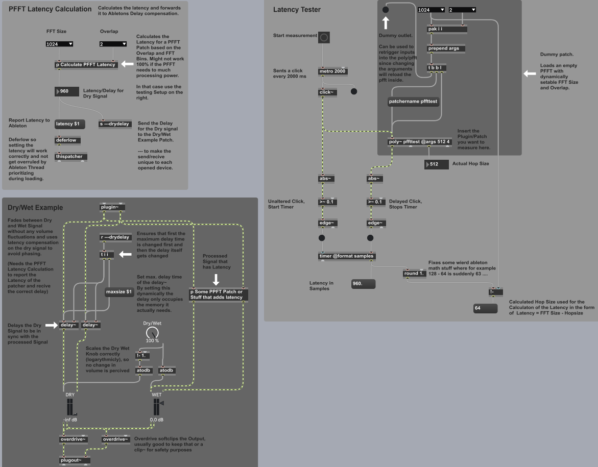 | Description: | (Disclaimer: This patch is for educational purposes and won't actually work as an effect. So, if you aren't working on a spectral device yourself, this is probably pretty useless to you.) PFFT is a genuinely useful module for spectral effects, but unfortunately I haven't found a single device or explanation that shows how to set the latency correctly. Probably because even the official documentation on the matter is not entirely correct. (yikes) Working latency compensation is crucial for correct timing, as well as for avoiding phase cancellation when using a dry/wet knob. This patch includes a patch calculating the correct latency of a PFFT object based on the FFT size and overlap, returning the latency to the patcher so that Ableton's Delay Compensation can work correctly. This also functions correctly upon loading the patcher. Feel free to copy-paste this patcher into your own devices. A test setup to measure the sample-accurate latency of a patcher/plugin is included as well, so you can verify that the latency is indeed calculated correctly. Or test other modules and plugins etc. as well. The test PFFT is also an example of how to change the FFT size dynamically. This whole topic gave me a real headache, and I'm really glad I finally figured out the math behind it. So, I hope this helps someone having the same troubles. If something still isn't working or something is unclear, comment below or send me an email, and I'll try my best to help out. XD Update 1.1: - Added an example on how to implement a constant Volume Dry/Wet with proper delay compensation on the dry channel to avoid phasing. - Added some arrows to make explanations clearer - Added some more explanations and structure - Just made it look better I guess Update 1.2: - Latency Calculation is working correctly inside MaxMSP as well when using different Signal Vectors. |
