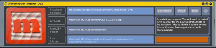 | Description: | This device downloads the entire Monomodular suite from within Live via SVN, then places the files in the appropriate directories within your setup. After a restart of Live, everything contained in the Monomodular suite should be available and functional. There is a link to the wiki and blog in the plugin, its recommended you take a trip over there for more information. |